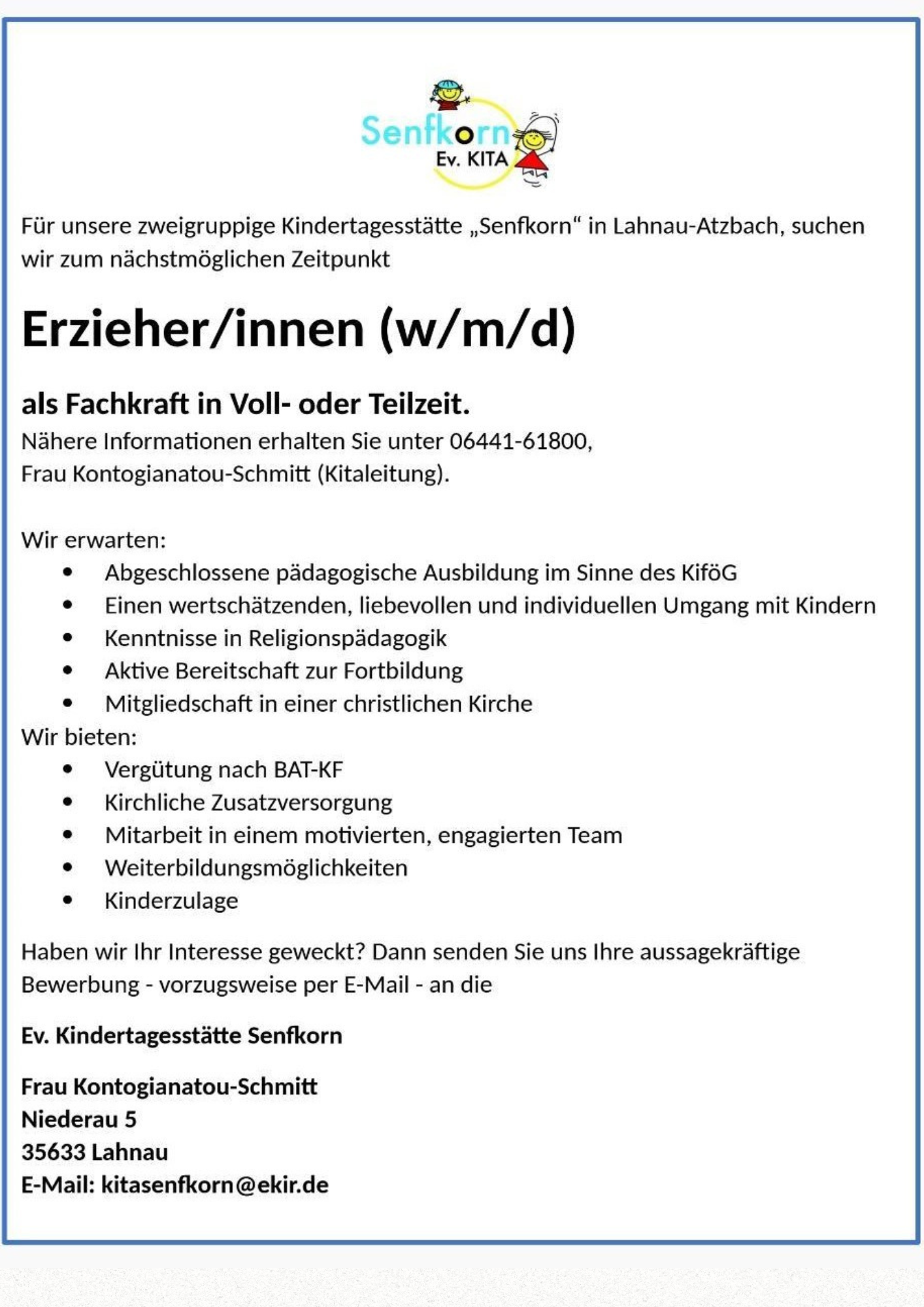 Für unsere zweigruppige Kindertagesstätte „Senfkorn“ in Lahnau-Atzbach, suchen wir zum nächstmöglichen Zeitpunkt
